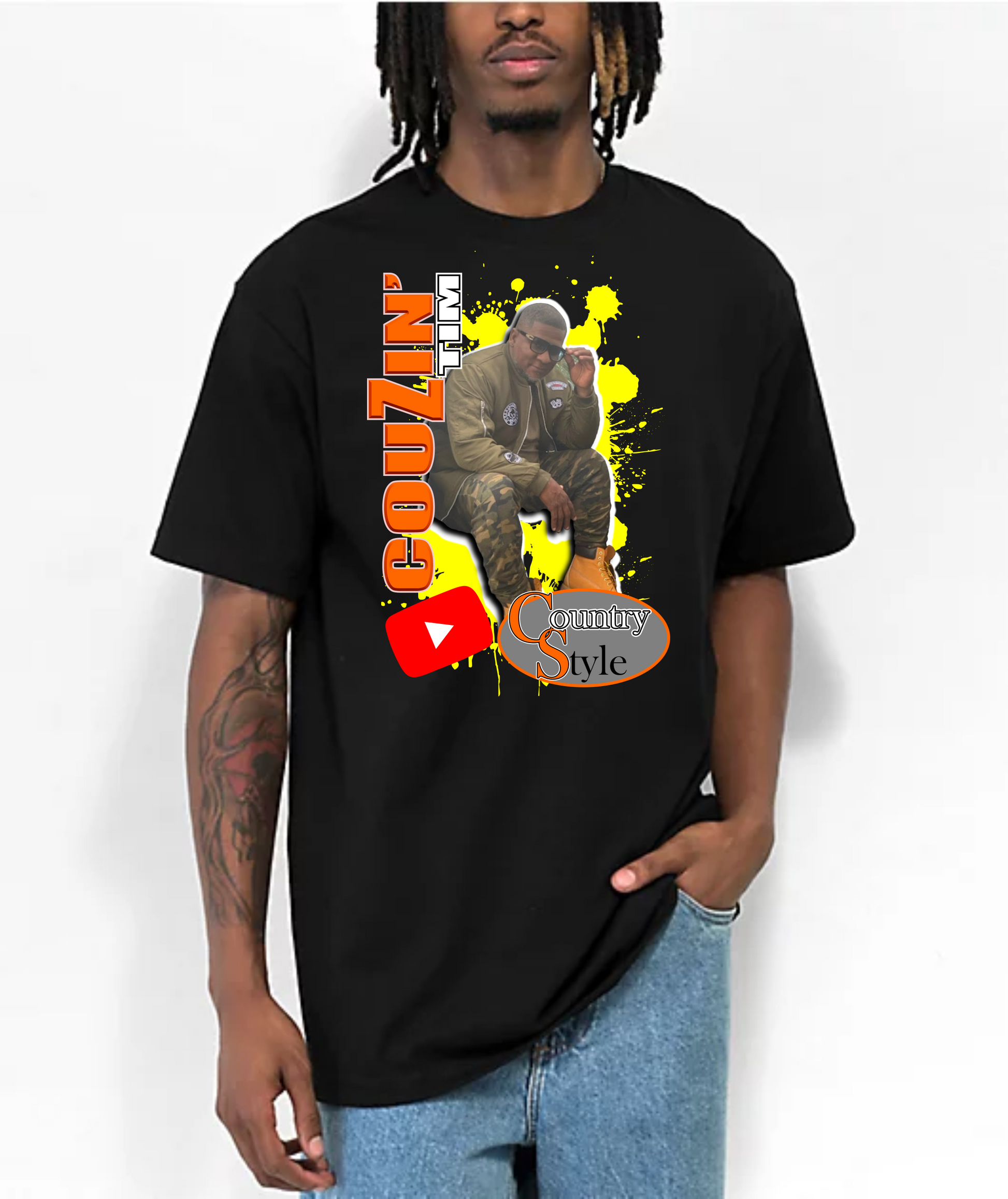 Graphic T design of CouZin Tim himself. Splattered background and Stamped with the Country Style logo